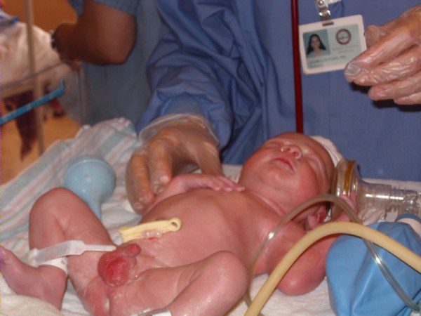 Isaac moments after birth, being worked on by neonatologists